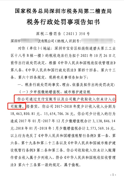 深圳某科技公司,通過支付寶賬號以及公司賬號收取收入,導(dǎo)致少計(jì)收入3411.85萬元,造成少繳增值稅571.24萬元以及城市維護(hù)建設(shè)稅。此外,稅務(wù)局通過核定征收的方式,查明該公司少繳企業(yè)所得稅37.43萬元。最終,上述公司被處百分之五十的罰款,共計(jì)3243277.46元。
